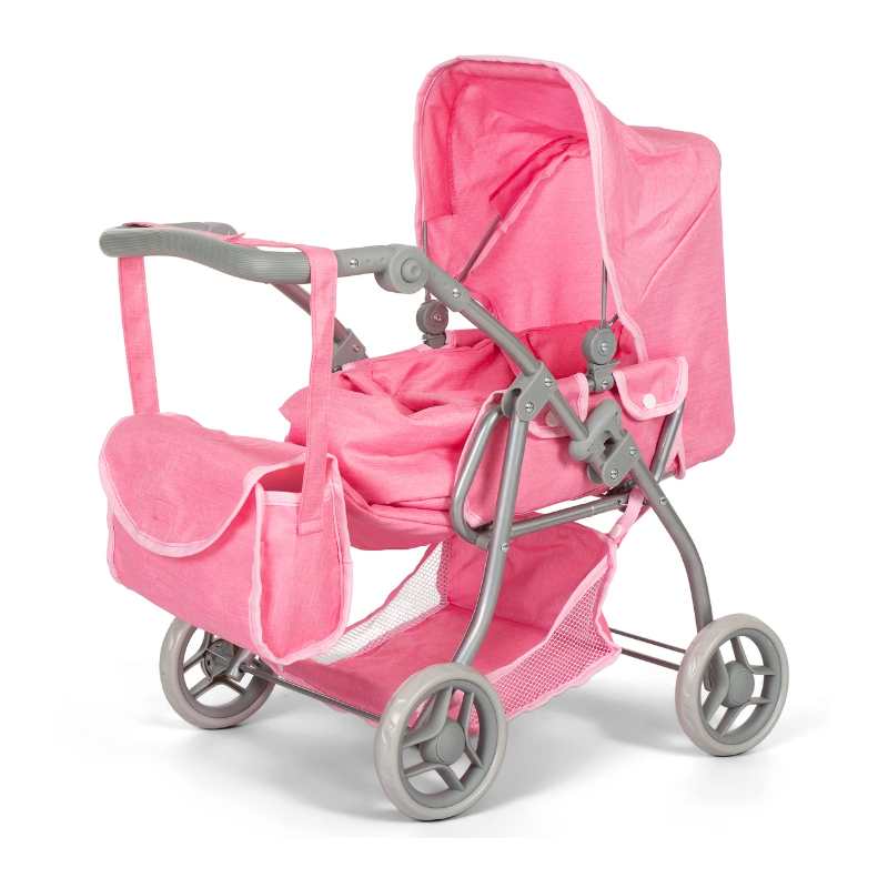 Denna praktiska kombivagn från MAMAMEMO® Dolls kan användas både som liggvagn och sulky. Den avtagbara liften gör att dockan eller nallebjörnen kan ligga säkert och bra. Liften har en längd på 42 cm. En fin och rymlig skötväska ingår, där det finns plats för blöjor, nappflaskor och andra nödvändigheter när du tar hand om din docka.