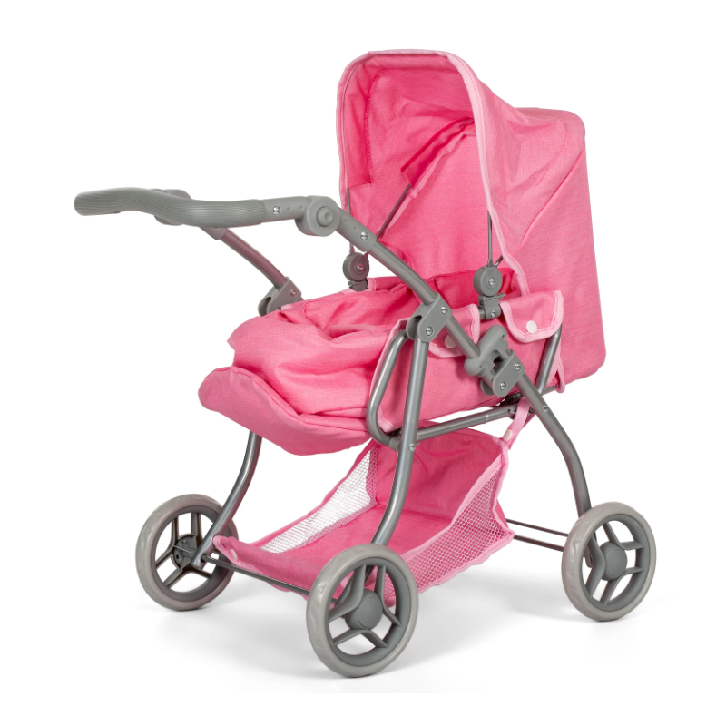 Om det inte finns plats för allt i skötväskan kan den praktiska förvaringskorgen under vagnen också användas till både dina egna och dockans tillhörigheter. Vagnen har praktiska hjul i plast, klädda med skumgummi och ett ledat styre som enkelt kan justeras mellan 34-61 cm.