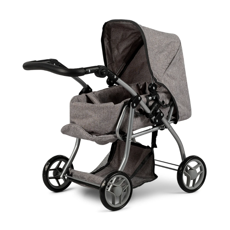 Om det inte finns plats för allt i skötväskan kan den praktiska förvaringskorgen under vagnen också användas till både dina egna och dockans tillhörigheter. Vagnen har praktiska hjul i plast, klädda med skumgummi och ett ledat styre som enkelt kan justeras mellan 34-61 cm.