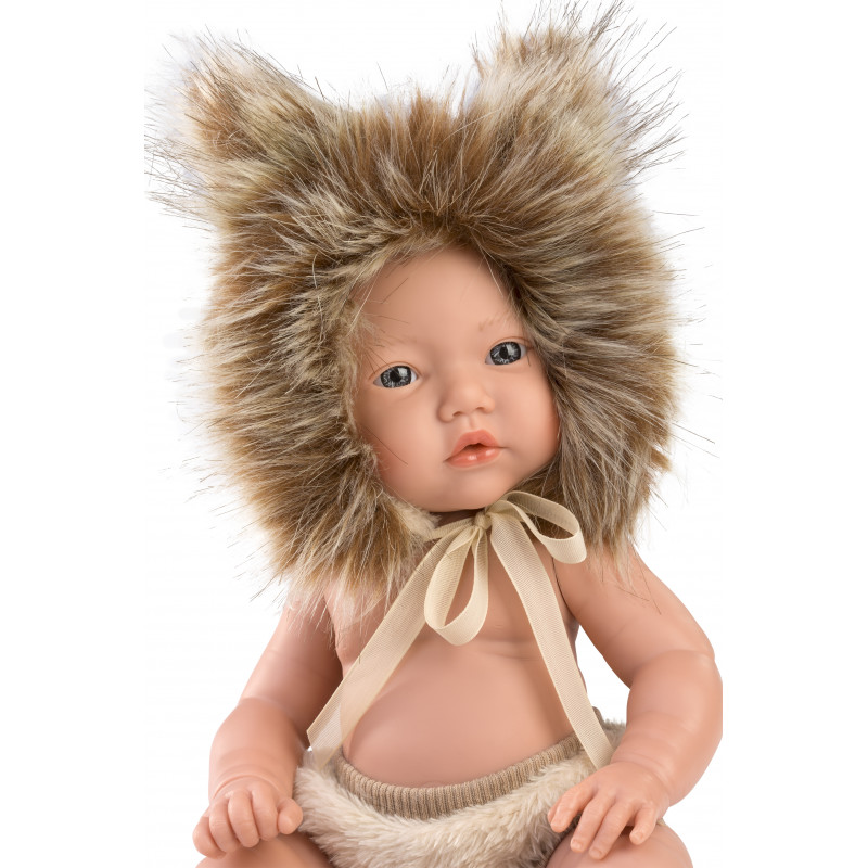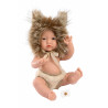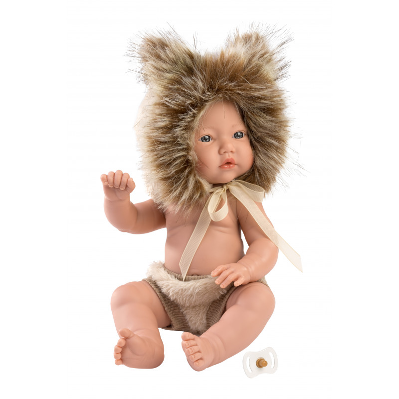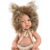 Leo är en liten babydocka med rörliga leder. Han är klädd i fluffiga kortbyxor och en mössa som är som en lejonman!