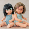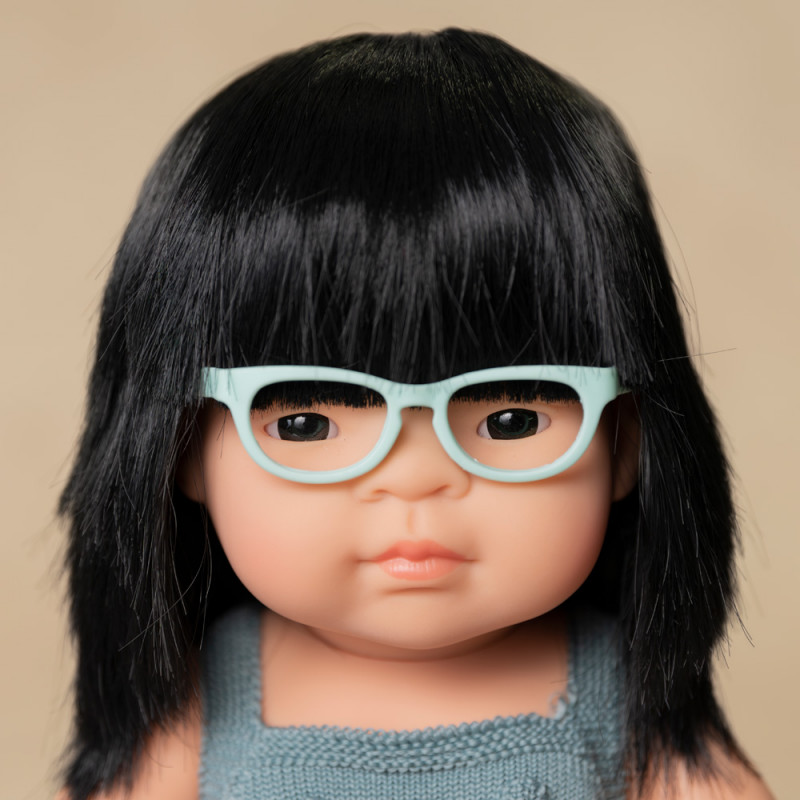 Babydocka Chi är en asiatisk flicka med glasögon och hon har en fin sparkdräkt i blågrått på sig.