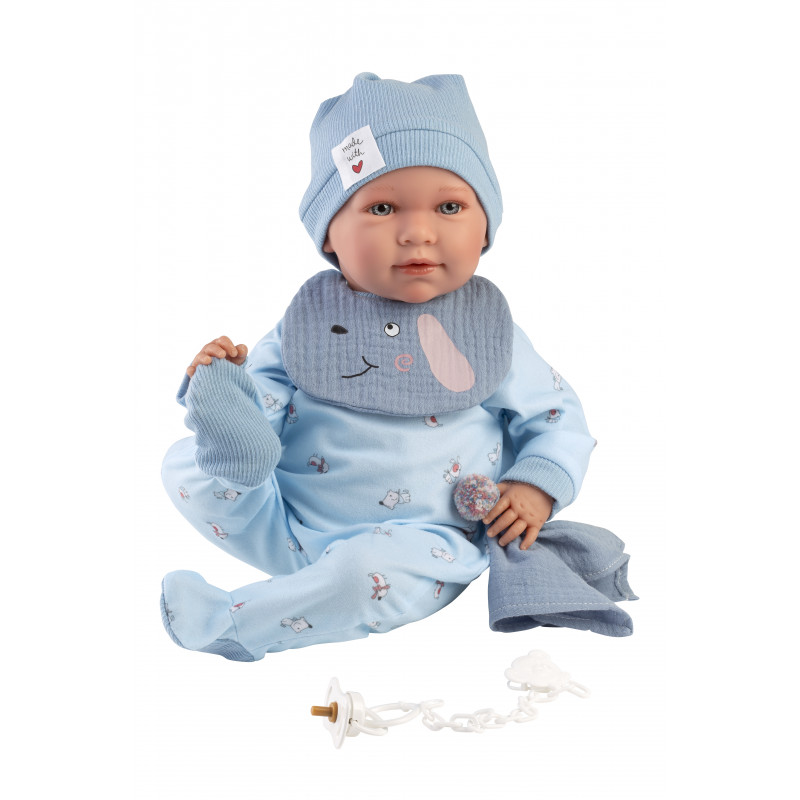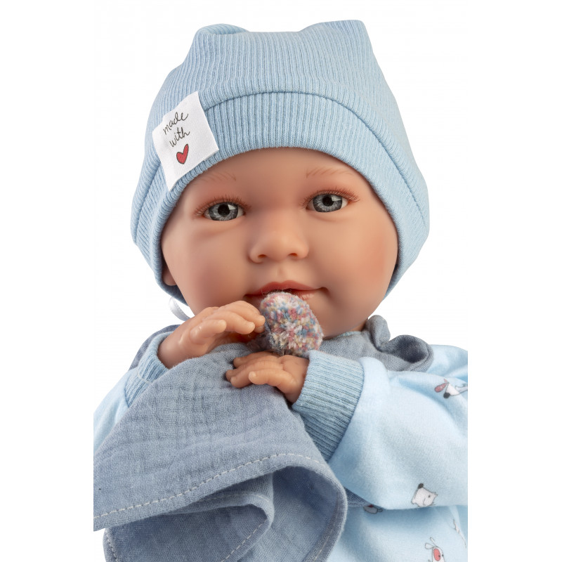 Axel är klädd i ljusbå one-piece med ett sött motiv, haklapp och mössa. Tryck dockan på magen så gråter han och säger på mama/papa. Dockan är fullt rörlig. Det ingår en napp och snuttefilt.