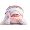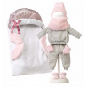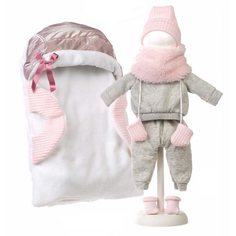 Klädesättet består av grå, stickad tröja och byxa, rosa stickad mössa, vantar, sockar och pälshalsduk, samt en babylift.