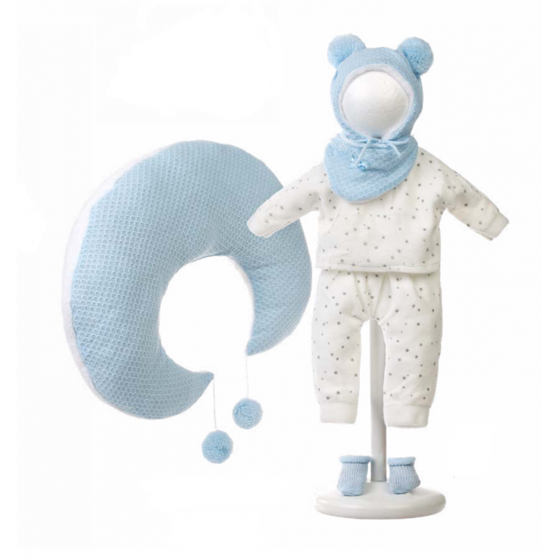 Klädesättet består av vita byxor och tröja med mönster, blå mössa och stumpor, samt en ljusblå månformad kudde.