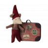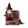 Den lilla reseväskan kommer med ett speciellt innehåll denna säsong. Inuti resväskan sover en liten julmus med en varm filt.