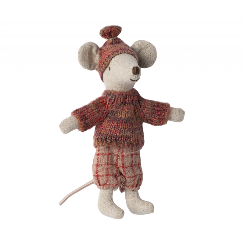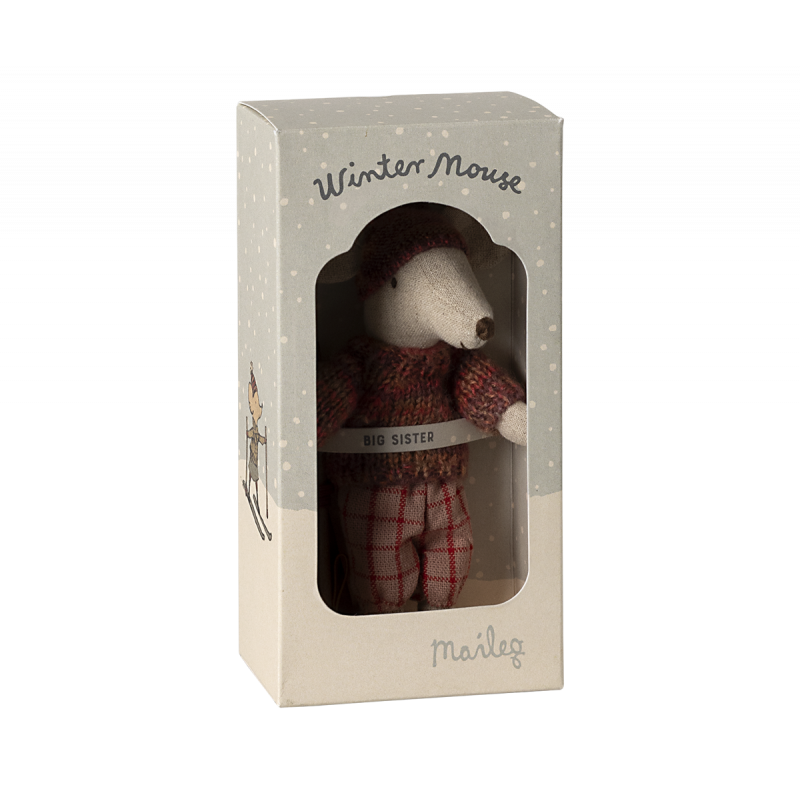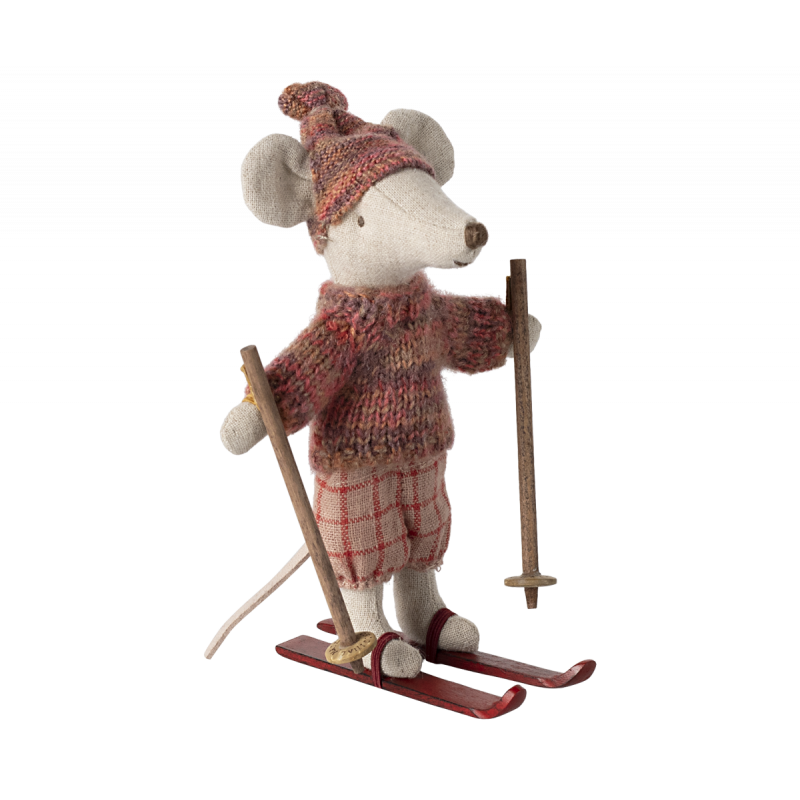 En mus redo för timmar av skoj i backen under den kalla vintern. Varje lekset innehåller en varmt klädd mus med ett par skidor och stavar. Titta på den lilla stickade mössan som håller öronen varma.