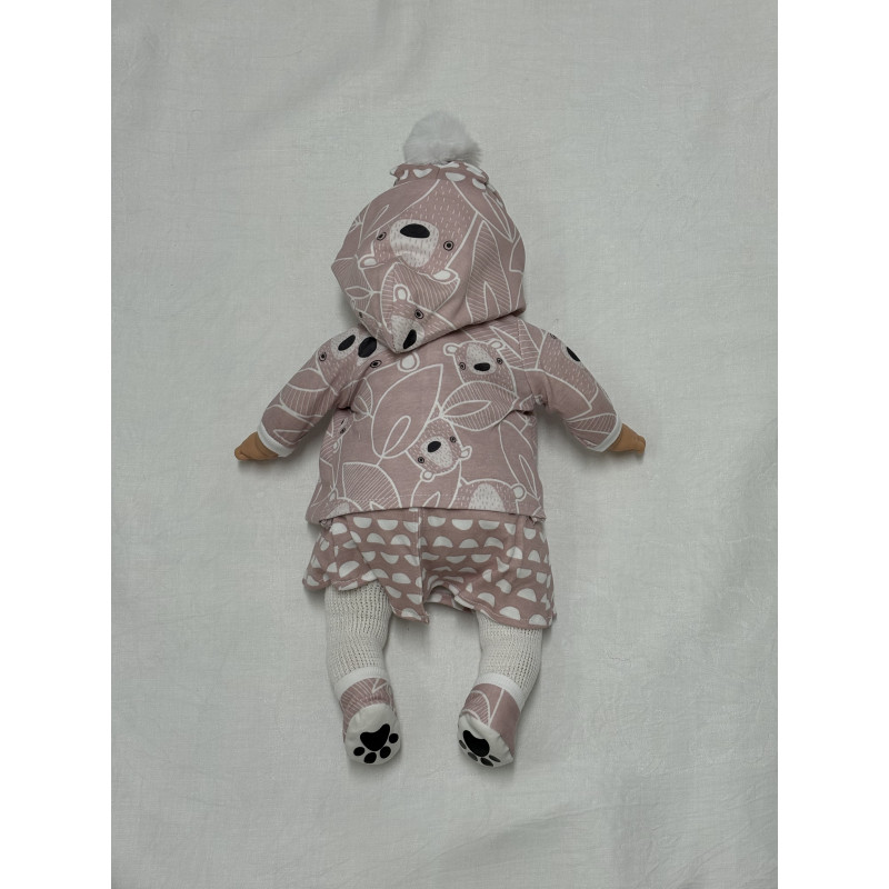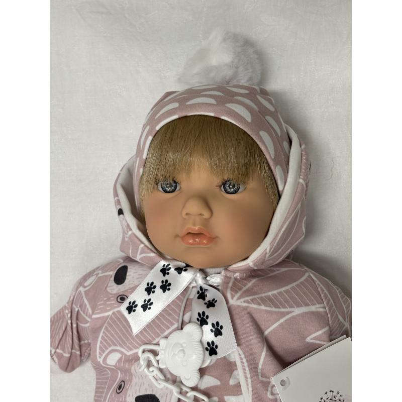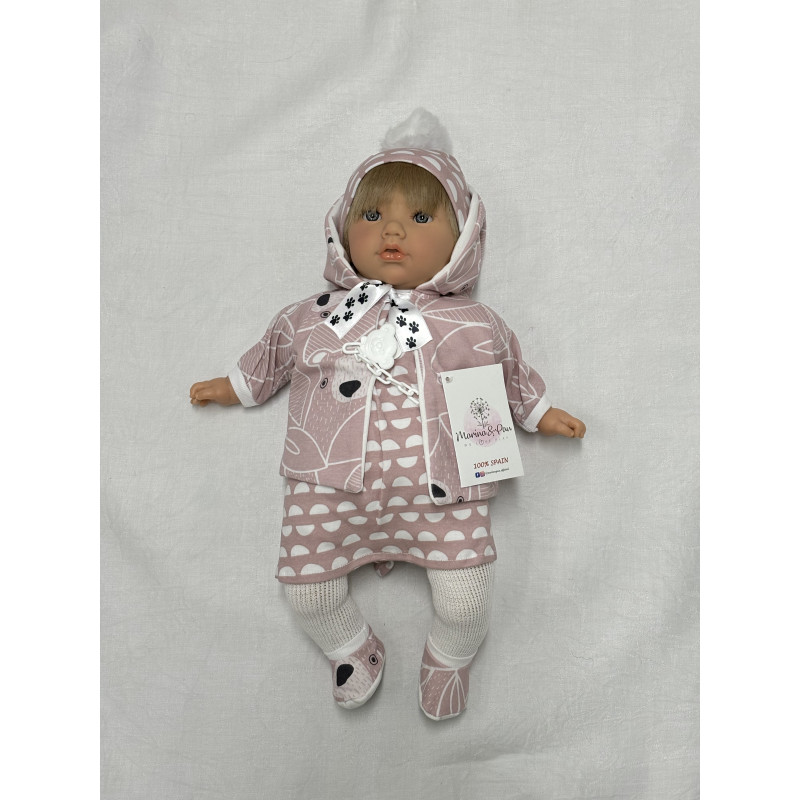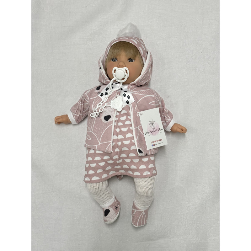 Alina är en 45 cm docka med tygkropp och är klädd i rosa klänning och matchande mössa, vita strumpbyxor, rosa jacka med björnar på samt rosa strumpor med tassavtryck under. Kommer även med en napp med en björn på napphållaren.