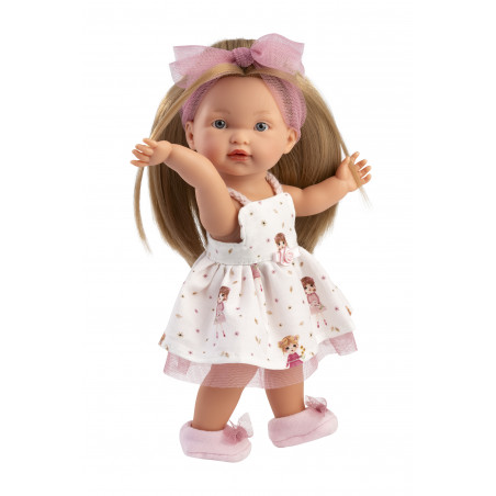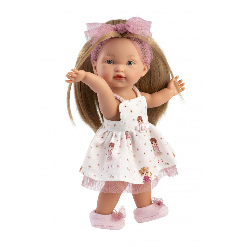 Lexie är klädd i en vit mönstrad klänning med tyllkjol under och ett par rosa skor. Sitt ljusa hår har hon tillbaka draget med hjälp av ett rosa hårband. Hon kan stå själv.