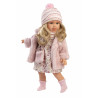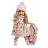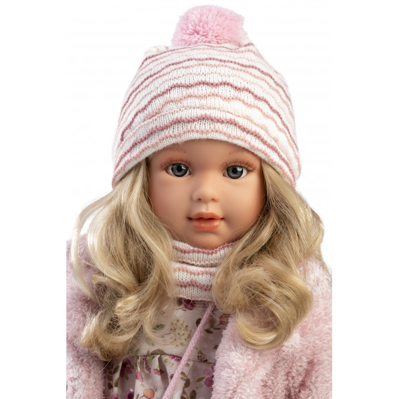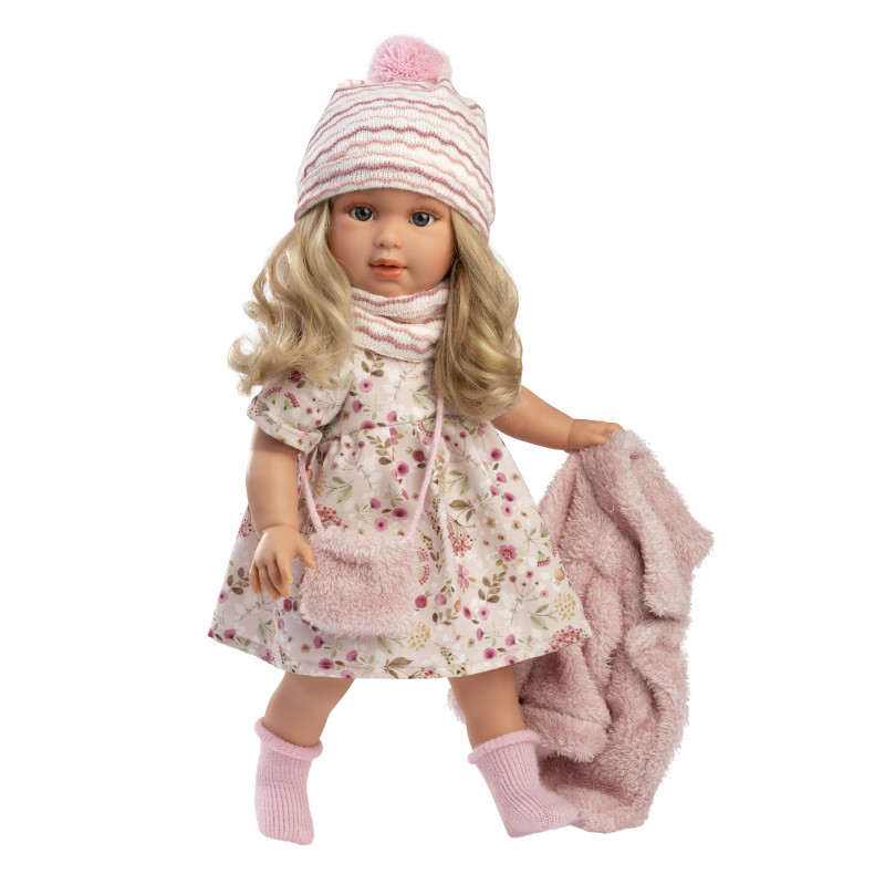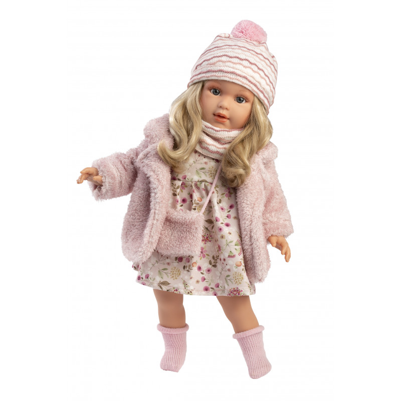 Fiona är klädd i en blommig klänning och rosa fluffig jacka med matchande handväska. Hon har matchande randig mössa och halsduk samt rosa strumpor.