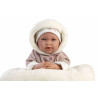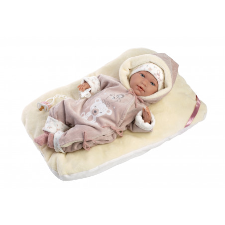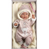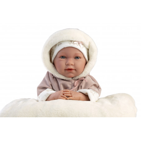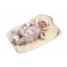 Renee är klädd i en rosa corduroy overall med text- och djurtryck. Mössan är vit med mönster på och har en liten rosa rosett framtill och strumporna är i en härlig rosa färg. Madrassen hon ligger på är mjuk och perfekt för Renee att ta en liten tupplur på!