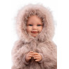 Björn är klädd i en super fluffig ljus brun overall. Det medföljer en napp som sitter i en napphållare som går att fästa på hans kläder.