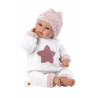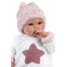 Amber är klädd i en vit sparkdräkt med rosa muddar och en stjärna på magen. Hon har en matchande rosa mössa på huvudet.