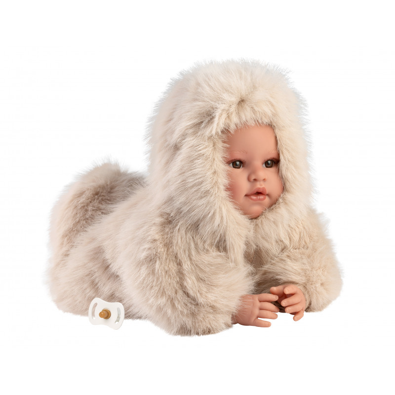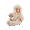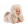 Linus är klädd i en super fluffig beige overall. Det medföljer en napp som sitter i en napphållare som går att fästa på hans kläder.