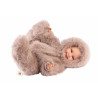 Björn är klädd i en super fluffig ljus brun overall. Det medföljer en napp som sitter i en napphållare som går att fästa på hans kläder.