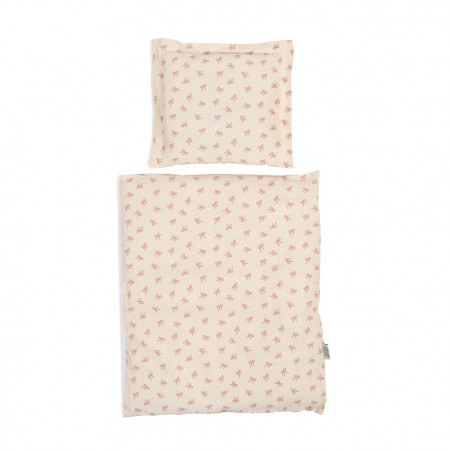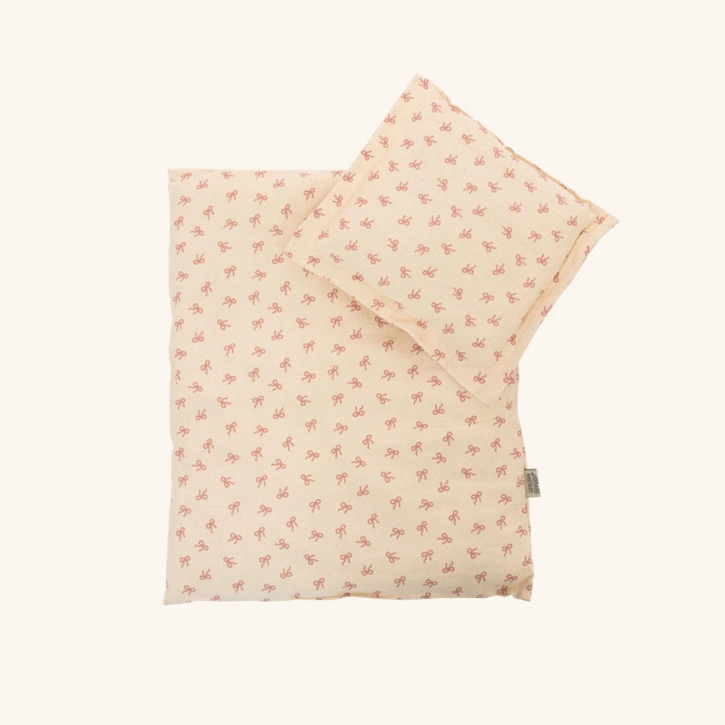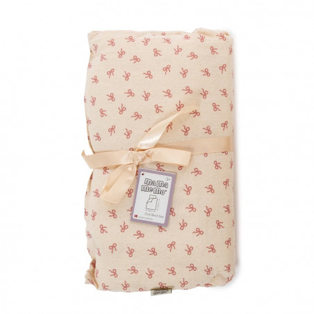 Ge din dockvagn eller dockskåp en söt och elegant touch med detta bäddset i en vacker ljusrosa färg, prydt med en fin rosettdetalj. Setet är tillverkat av 100 % bomull, vilket ger en mjuk och bekväm känsla, perfekt för din docka. Passar de flesta dockor och deras tillbehör, och den krämvita färgen i kombination med den rosa rosettdekorationen skapar en feminin och charmig look.
