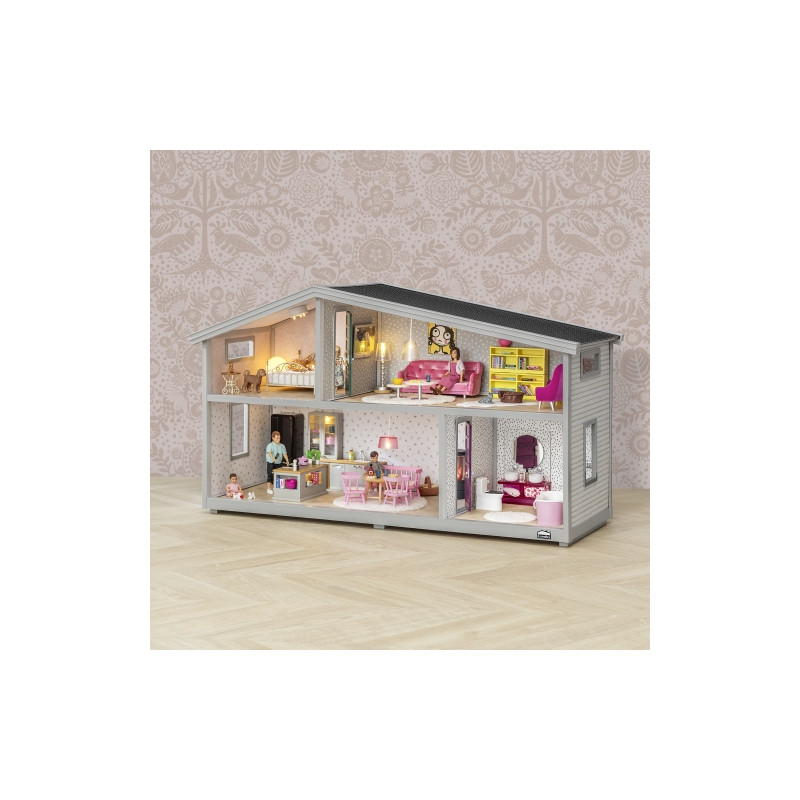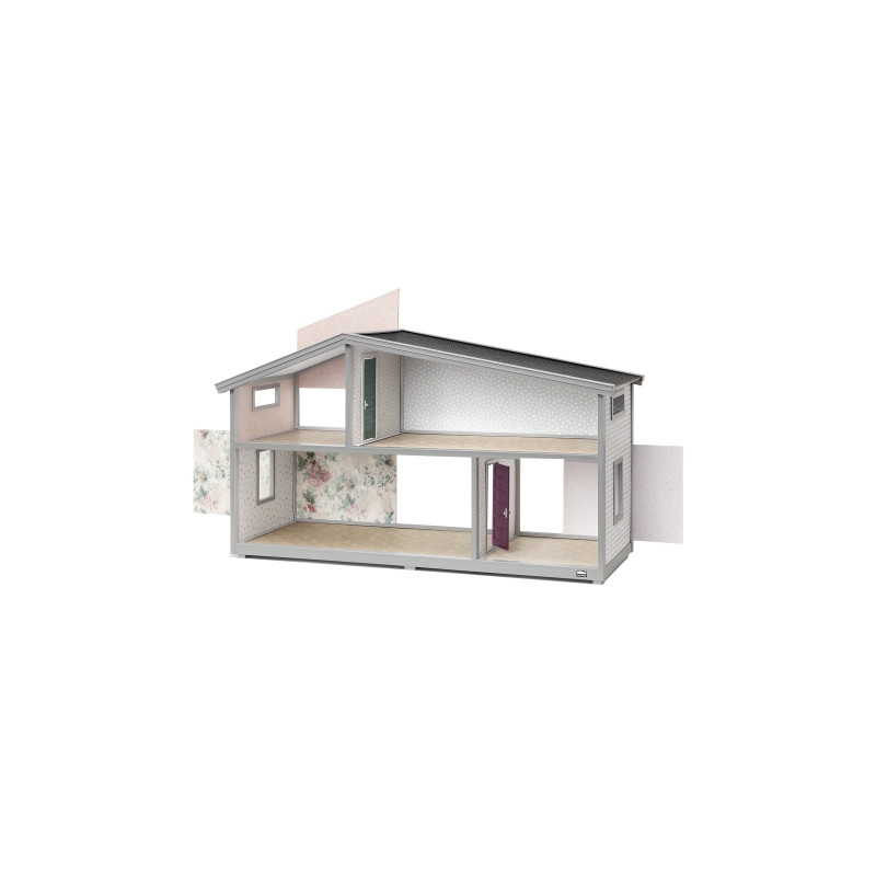 Det här lekfulla dockhuset har en öppen planlösning, vackra tapeter från Sandberg Wallpaper och dörrar målade i olika lekfulla färger. Inred som du själv vill med trappan, lamporna och alla andra lekfulla tillbehören som finns till Lundby.