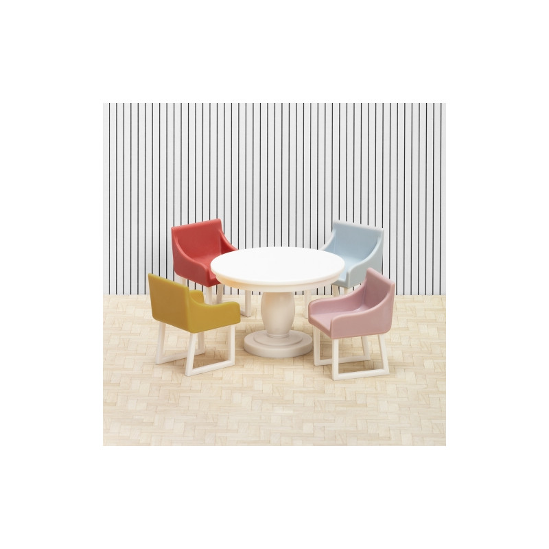 Vid det här bordet kan dockhusfamiljen njuta av många goda middagar. Stolarna är mjuka och sköna för dockorna att sitta i.