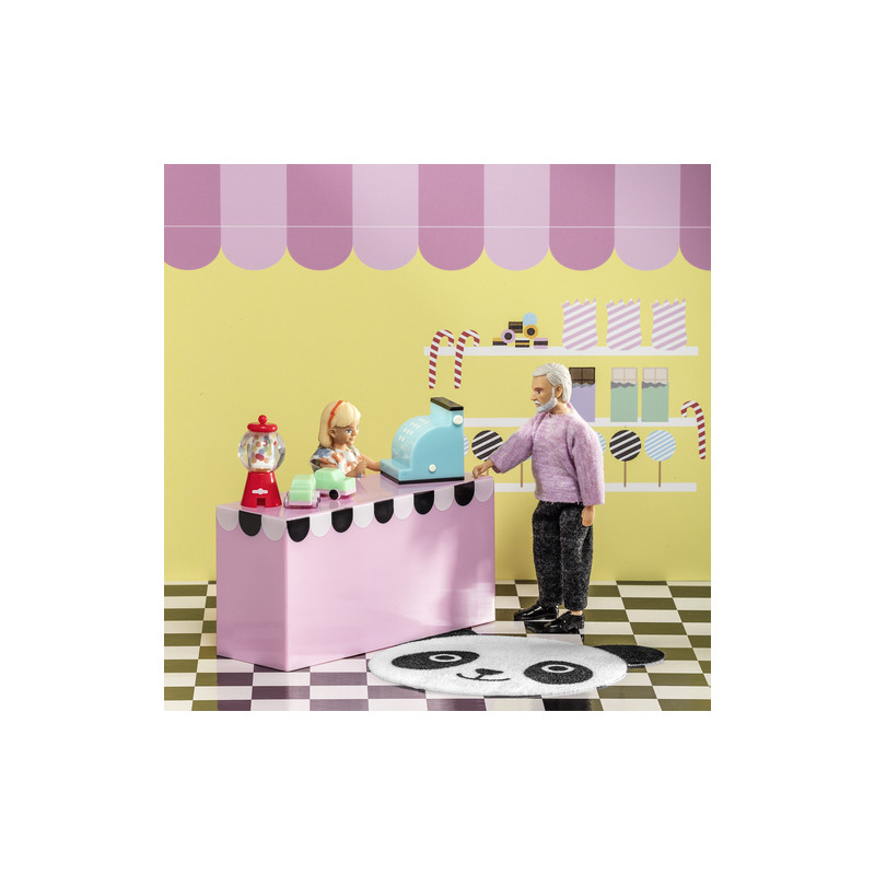 Det du behöver för att lyckas i ditt nya karriärsval är en kassadisk, en kassaapparat, en matta för kundernas trivsel, leksaksbilar som barnen kan leka med och inte att förglömma, en tuggummiapparat. Drömmen går i uppfyllelse med detta set från Lundby.