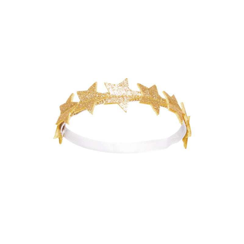 Vacker tyllklänning dekorerad med gyllene stjärnor och ett guldband i midjan, med fastsydda guldvingar på ryggen. Det medföljande stjärnprydda hårbandet i guld gör stilen komplett.