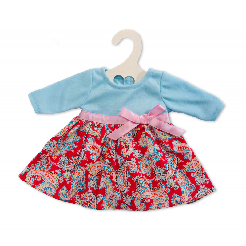 Fin dockklänning med blå överdel, paisley mönstrad kjol och rosett i midjan.