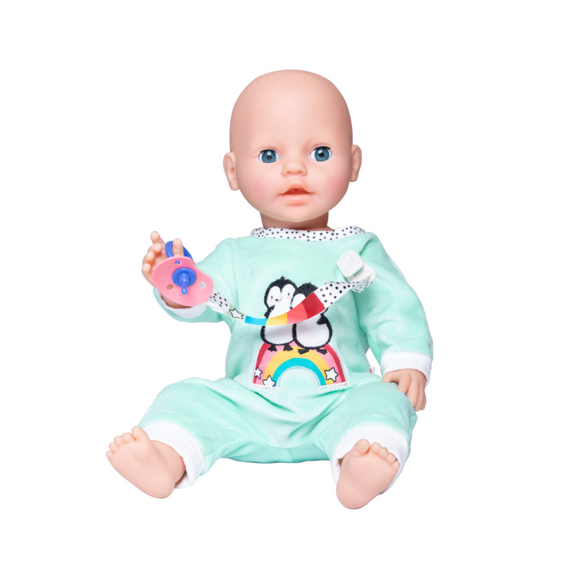 Fluffigt mysig turkos sparkdräkt till dockan, men söta pingviner broderade på magen.