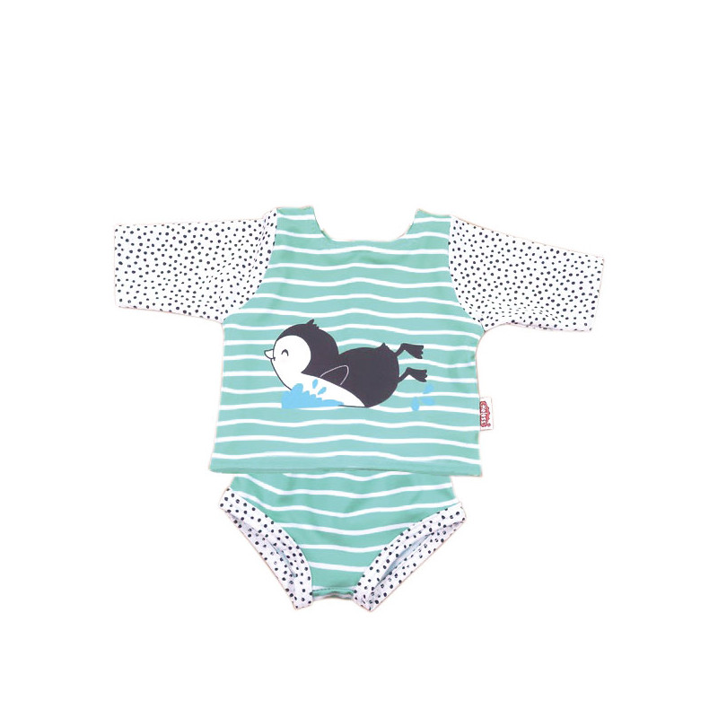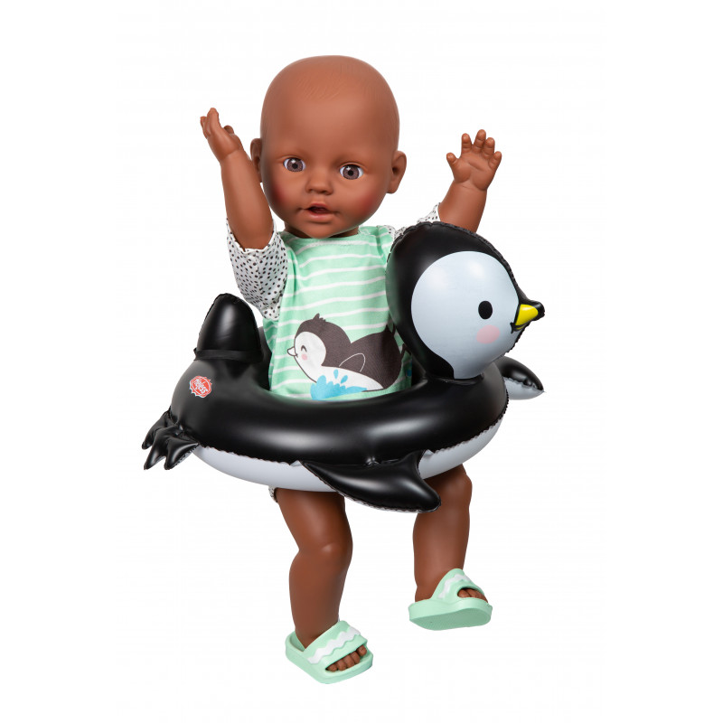 Består av en pingvin badring, en badkläder och ett par turkos badtofflor.
