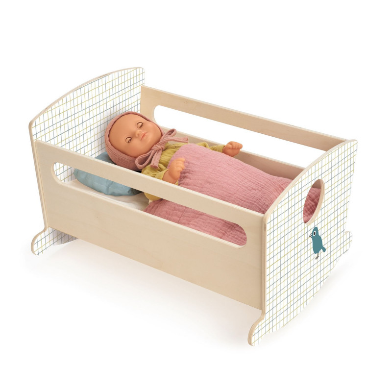 En snygg liten vagga av trä som kommer med en mjuk madrass, en liten blå kudde och en skön rosa filt - perfekt för när dockan ska sova. Ett mysigt näste där dockan kan vaggas till sömns av sin lilla förälder. Vaggan är tillverkad av naturligt trä med utsågade hål som gör det enklare att flytta omkring den, är målad i mjuka, giftfria färger och har en bild av en söt fågel på ena kortsidan. Vaggan passar till dockor som är 30 till 36 cm höga och är en del av POMEA-kollektionen med dockor och tillbehör. Viss montering krävs.