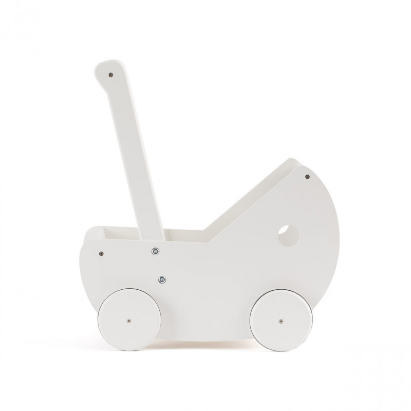 Dockvagn inklusive bäddset och kudde i 100% bomull. Fyllning i kudden i 100% polyester. I vitmålade trä. Innermått L30-35 x B20 cm.