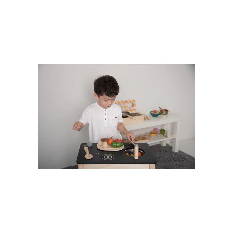 Grönsaksset med svamp, rödlök och schalottenlök samt kniv. En kul leksak för matleken där grönsakerna sitter ihop med kardborre och kan "skäras" i sär. Allt ligger i en smidig nätpåse som går att snörpas åt. En ekologisk och giftfri träleksak från PlanToys.