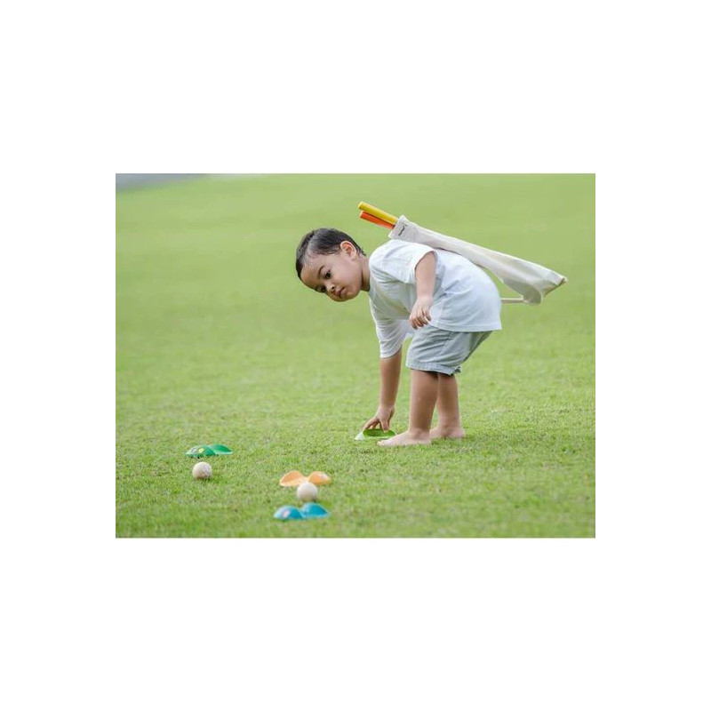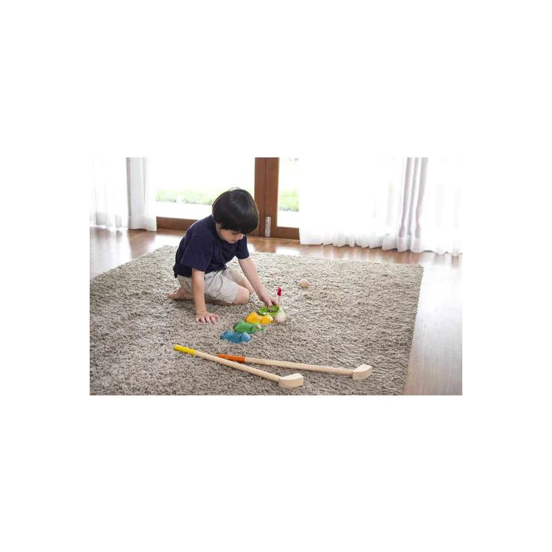 Låt barnet spela golf! Härligt ekologiskt minigolfset i skönt trä. Innehåller 2 golfklubbor, 2 bollar, 1 flagga 3 olika utmanande banor samt 1 hål - allt i en fin väska. En ekologisk och giftfri träleksak från Plan Toys.