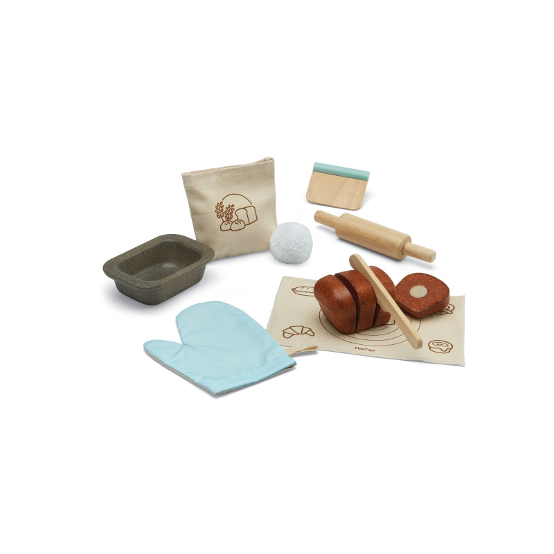 Det här gulliga bagarsetet kommer med en brödlimpa som kan delas med medföljande brödkniv, brödform, degdelare, ugnsvante, en påse mjöl, kavel, samt en kavelmatta. Ekologisk och giftfri leksak från PlanToys.