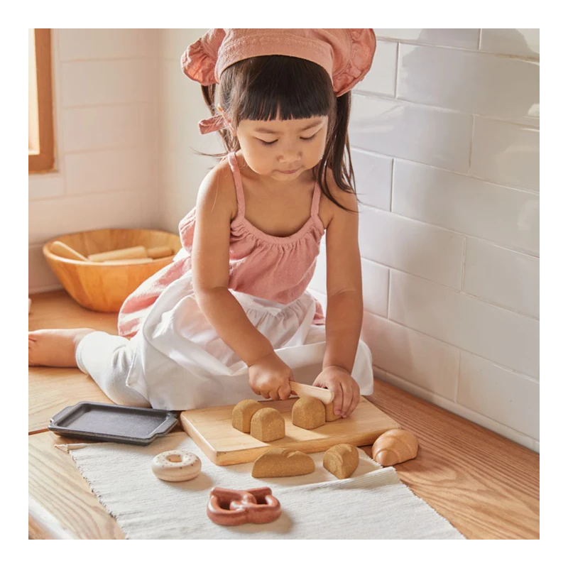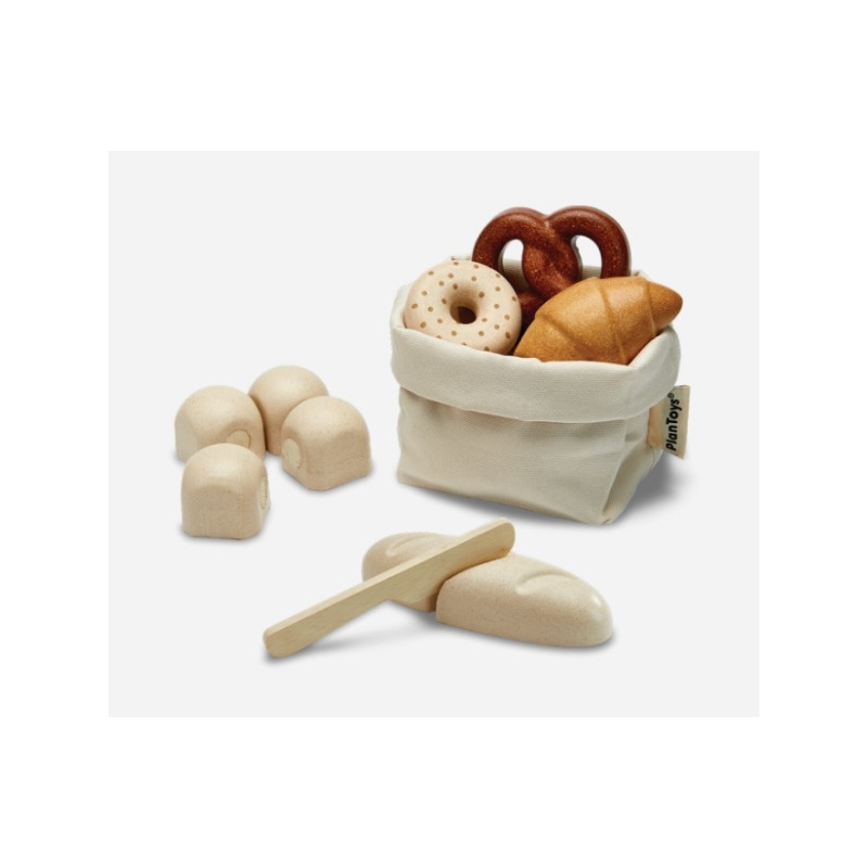 Mysigt brödset med baguette, frallor, croissant, kringla och munk. Kommer i en fin tygpåse. Ekologiska och giftfria träleksaker tillverkade av gummiträd.