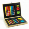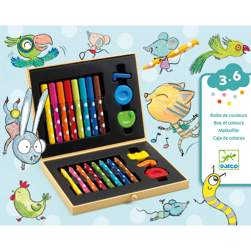 Färgpennor anpassade för de yngsta barnen i en fin låda. Alla färgerna är enkla att tvätta bort från händer, kläder, bord (och väggar). Utsidan av lådan är dekorerad med bilder som kan dekoreras med de härliga färgerna. . Innehåller 8 färgpennor, 8 tuschpennor och 6 kritor. . Förpackningsstorlek