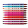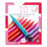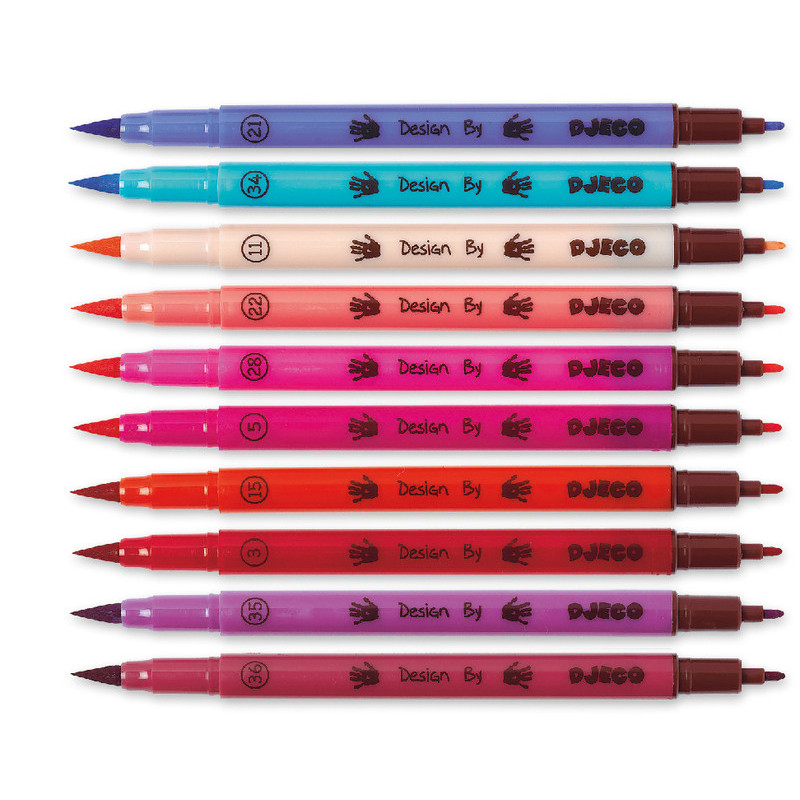 Ett set med 10 st filtpennor med dubbla spetsar och söta färger - vinröd, mörklila, röd, cinnoberröd, mörkrosa, ljusrosa, gammelrosa, hudton, ljusblå och ljuslila. Pennorna har en spets som är smal och fast samt en spets som är mjuk och pensel-lik för att göra streck med varierande bredd och fylla i större ytor. Filtpennorna håller en hög konstnärskvalitet och låter barn (och andra) att skapa vackra konstverk hur den än vill. Färgen går att tvätta bort från händer, kläder och liknande ställen du inte vill ha den. ".