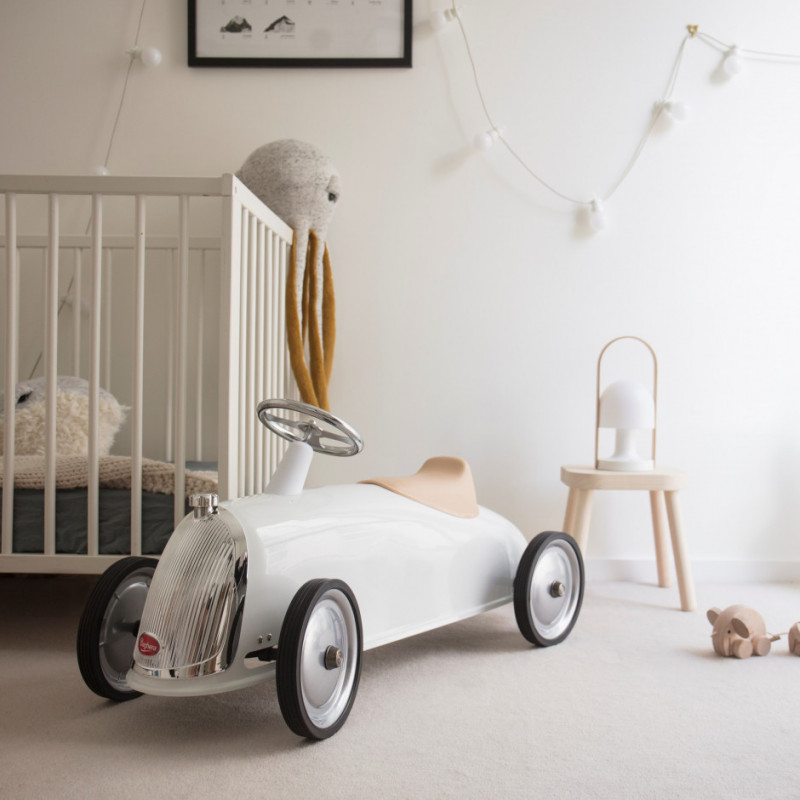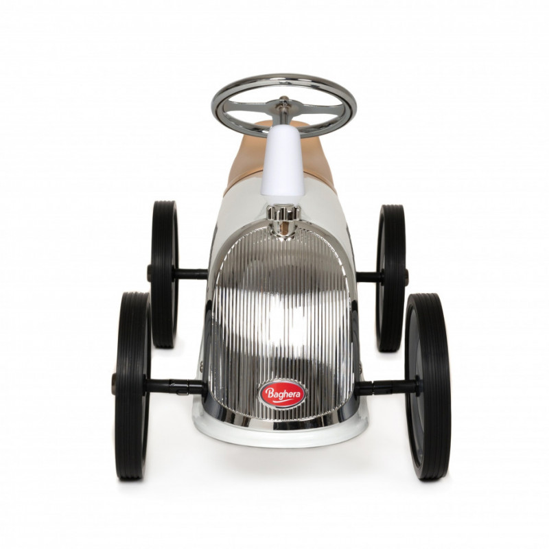 Elegant design i snövit metall med kromgaller i retrostil. Barnet sitter bekvämt på sin rider som är stabil och robust.
