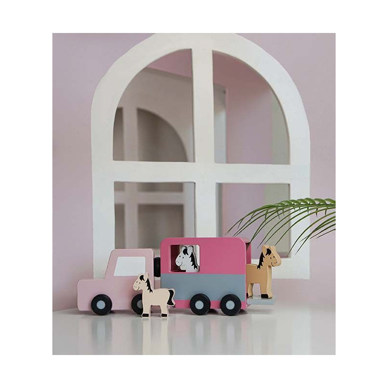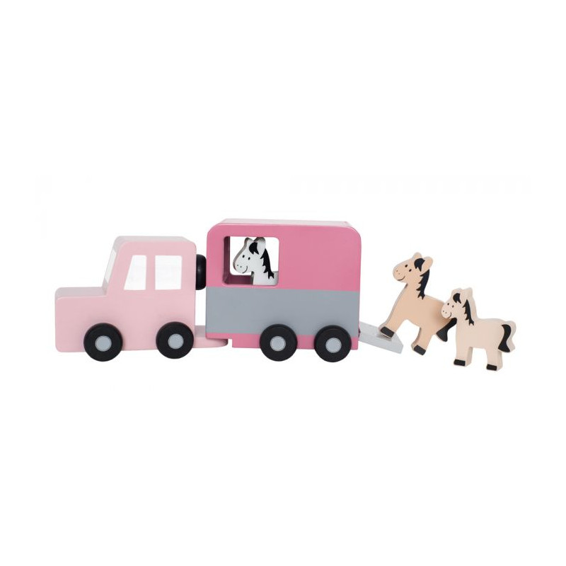 Denna söta hästtrailer är ett måste för alla hästtokiga barn. Trailern har 3 tillhörande hästar som du kan sätta in i släpet. Släpet är även avtagbart så att du kan köra runt endast trailern.