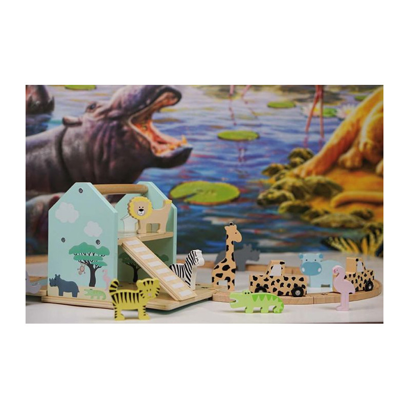 Med vår nya tågbana safari kan du enkelt ge dig ut på en tur på Afrikas savann. På savannen finns de vanligaste djuren som du säkert känner igen. Kan du namnen på allihop? När resan är slut kan djuren tryggt gå in och lägga sig under skuggan i det lilla huset. Det finns även en liten stege så man kan klättra upp och sätta sig på taket och se på utsikten eller bara sola sig.