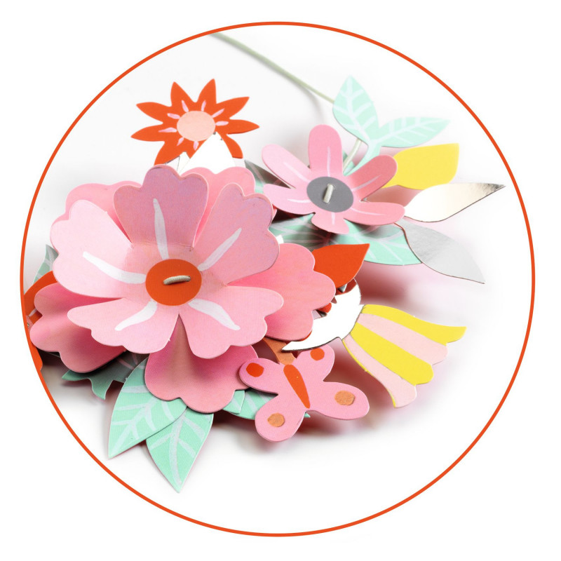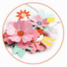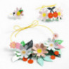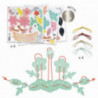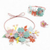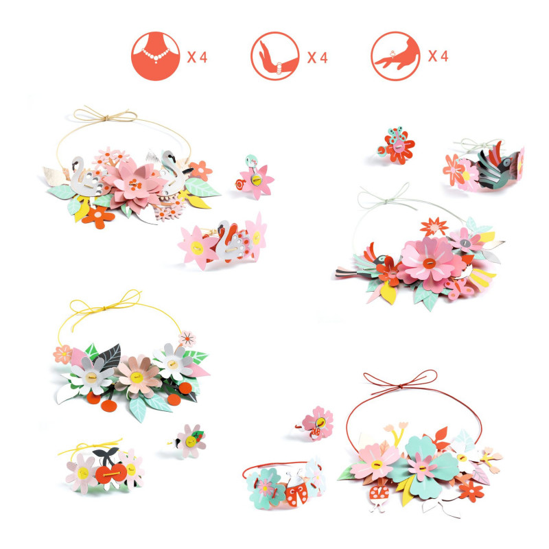 Ett kreativt DIY set med pyssel där du får göra många vackra smycken av pappersblommor. Materialet räcker till att göra 4 set, vart och ett med matchande ring, armband och halsband samt med sin egen färg på den elastiska tråden som håller ihop smycket. De utstansade delarna har vackra silverskimrande detaljer och för att underlätta skapandet är delarnas hål numrerade på baksidan - vid monteringen är det bara att trä det elastiska snöret genom delarnas hål i nummerordning, och när smycket är klart syns inte numren framifrån. Ett br