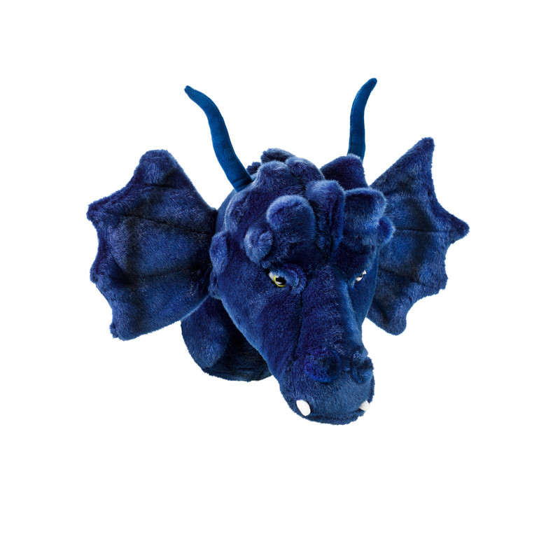 Vackert kornblått djurhuvud att hänga på väggen. Med stora, gröna ögon. En fin prydnad för barnrummet. Tänk att ha en drake som beskyddare i sitt eget rum! Hängs upp på väggen på skruv eller spik i en ögla som finns baktill på huvudet.