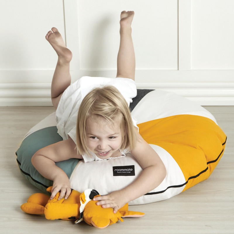 En underbart ljuvlig golvkudde i organisk bomull och med separat innerdel fylld med plastpärlor. Kudden är perfekt till myset och leken på golvet. Kanske ligga där och njuta en stund och titta i en bra bok?