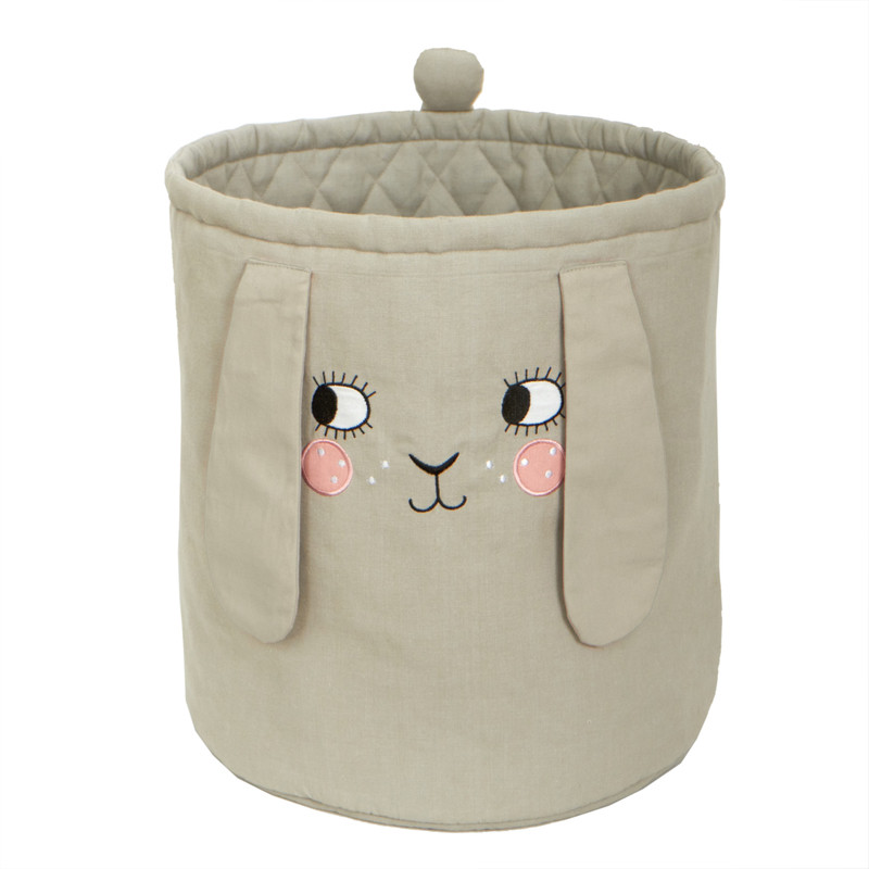 Charmig förvaringskorg för tvätt eller leksaker. Utformad som en söt kanin. Sydd i organisk bomull och polyesterstoppning. (Oeko-Tex Standard 100). Broderad design.