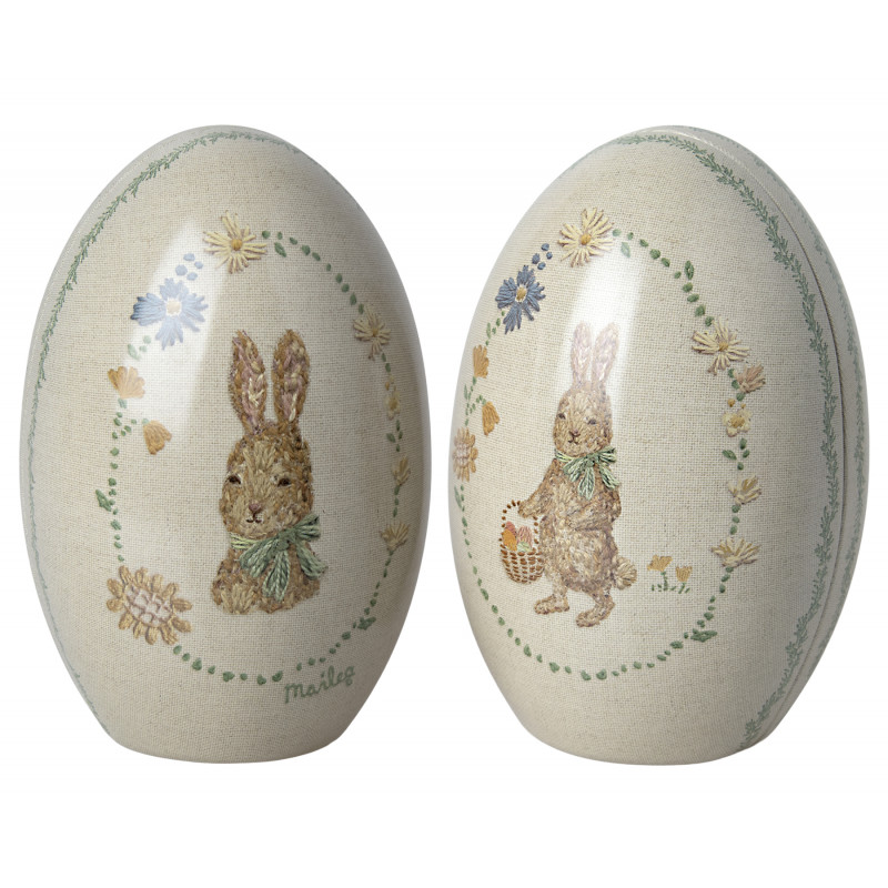 Ett set med 2 påskägg i metall. Det mindre ägget (11cm) får plats i det större (14cm). Dekorationen på äggen är Dorthe Mailils personliga broderi som gjordes till ett vackert tryck på äggen. Metalläggen följer EU - livsmedelsförordningen.