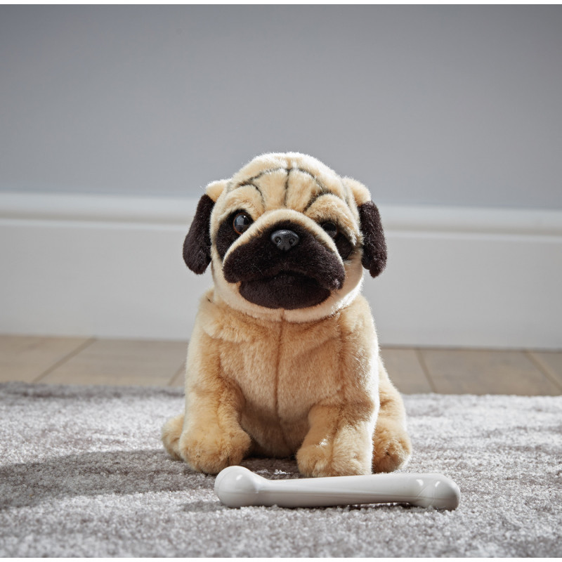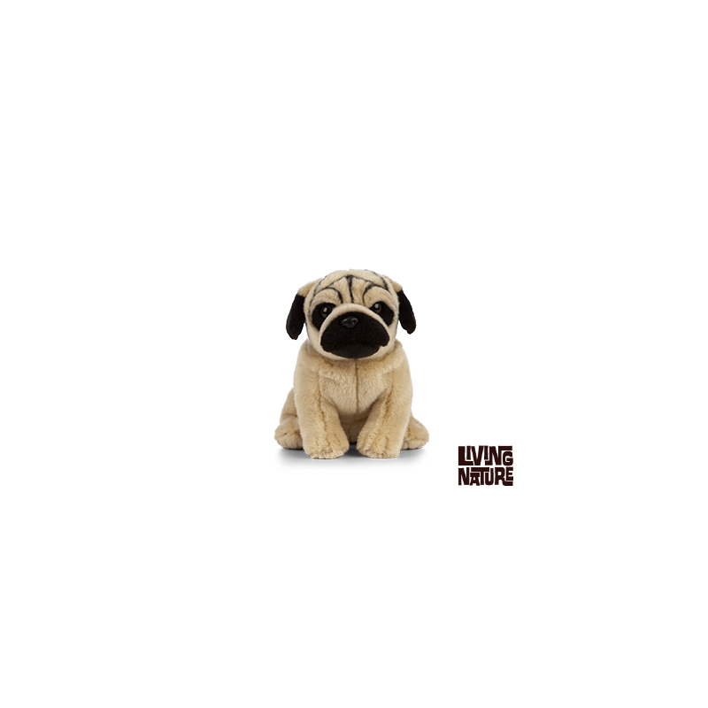 En rar och naturtrogen mops i vackert beige och svart.  En charmig och glad liten vovve med stora fina öron och mjuk päls i plysch.  En raring att tycka och hålla av länge.  Bör ej lämnas utan uppsikt i spjälsängen hos små bebisar.  Storlek: ca H16 x B12 x D25 cm