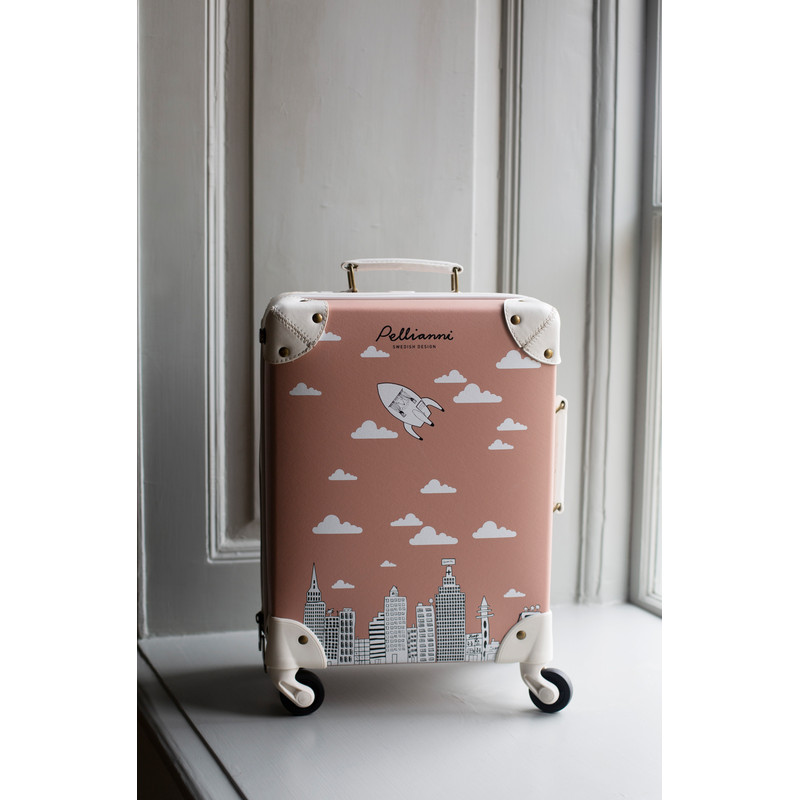 Ursnygg resväska typ kabinväska med läckert tryck. Perfekt att packa barnets saker i till resan, eller kanske använda som leksakslåda? Med avdelare mellan topp och botten (praktiskt när väskan öppnas) och ett litet fack i tyg på ena sidan av avskiljaren, smidigt för småsaker.