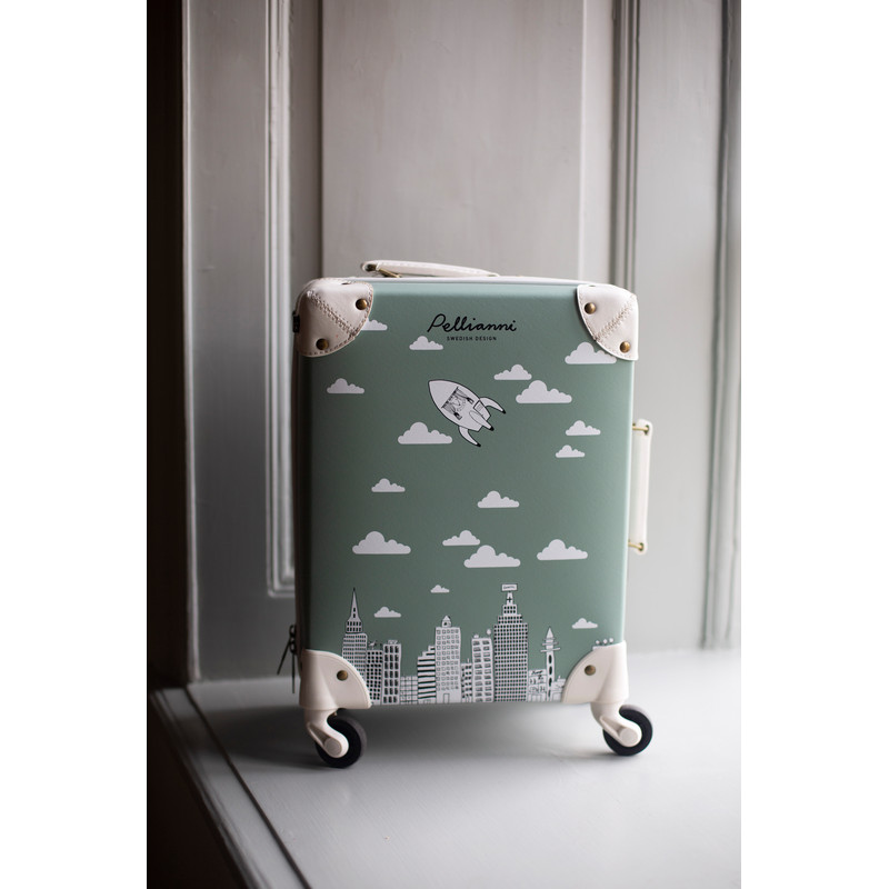 Ursnygg resväska typ kabinväska med läckert tryck. Perfekt att packa barnets saker i till resan, eller kanske använda som leksakslåda? Med avdelare mellan topp och botten (praktiskt när väskan öppnas) och ett litet fack i tyg på ena sidan av avskiljaren, smidigt för småsaker. Tillverkad i ekovänliga material: PU, PVC och PP. Med 4 hjul och teleskophandtag.