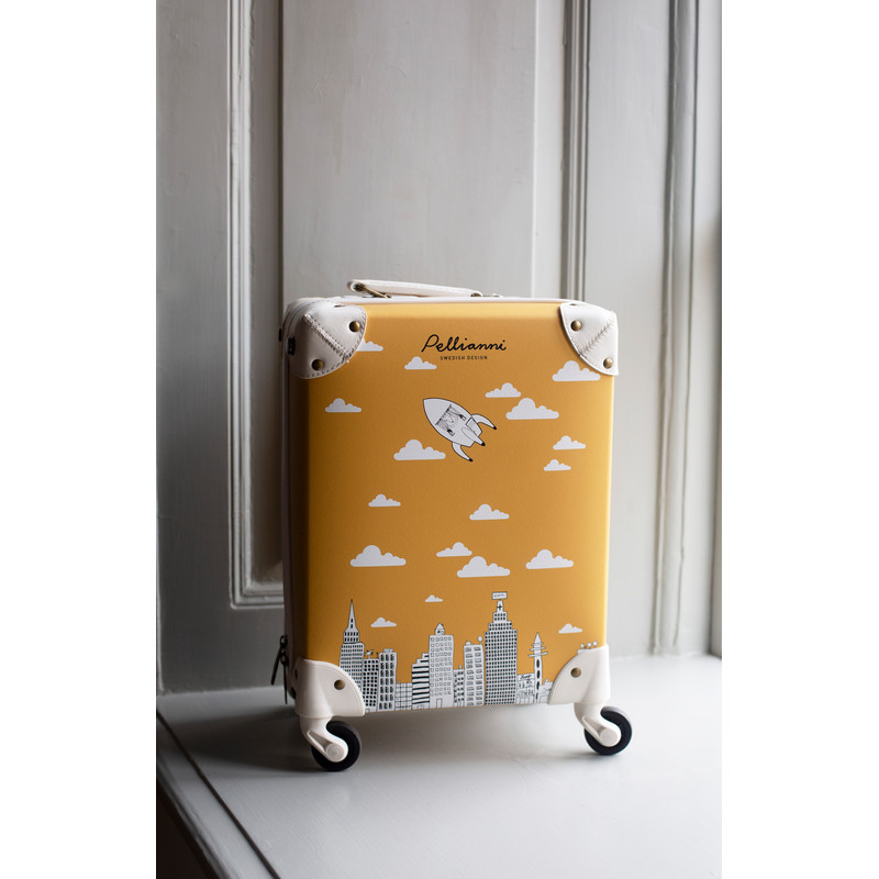Ursnygg resväska typ kabinväska med läckert tryck. Perfekt att packa barnets saker i till resan, eller kanske använda som leksakslåda? Med avdelare mellan topp och botten (praktiskt när väskan öppnas) och ett litet fack i tyg på ena sidan av avskiljaren, smidigt för småsaker. Tillverkad i ekovänliga material: PU, PVC och PP. Med 4 hjul och teleskophandtag.