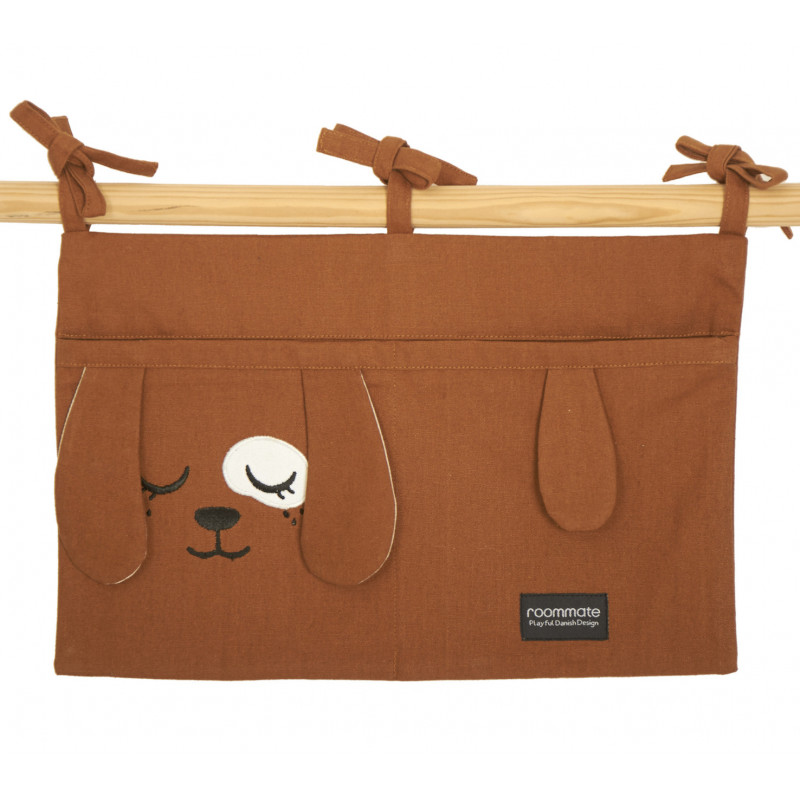 En riktigt snygg förvaring med två fickor i form av en brun hund att hänga på sidan av sängen eller knyta fast någon annanstans. Tillverkad i OEKO-TEX certifierad ekologisk bomull med applikationer och broderi samt tre uppsättningar knytband att hänga upp förvaringen i. Tvätt: strykfritt 30°, hängtorkas. Storlek: 35 cm bred, 25 cm hög.