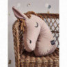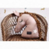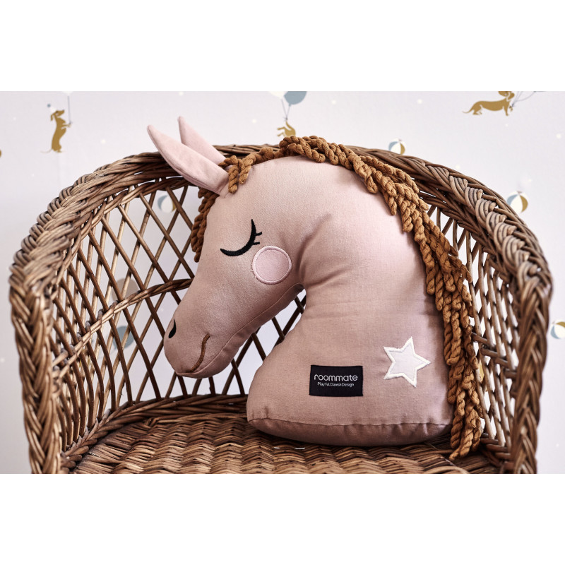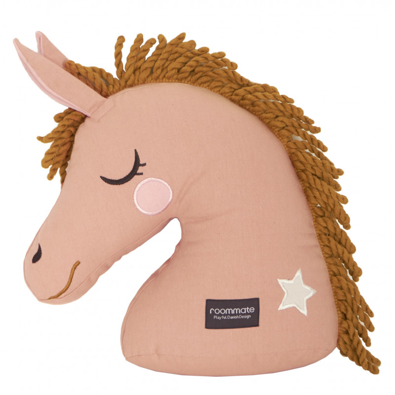 En kul ekologisk kudde i form av ett rosa hästhuvud med ljusbrun man av garn. Perfekt för små hästintresserade eller sådana som tycker om djur. OEKO-TEX certifierad och tillverkad i ekologisk bomull med polyester fyllning. Tvätt: skontvätt 30°C, hängtorkas. Storlek: 34 cm hög (44 cm med öron och man rakt upp) 34 cm bred