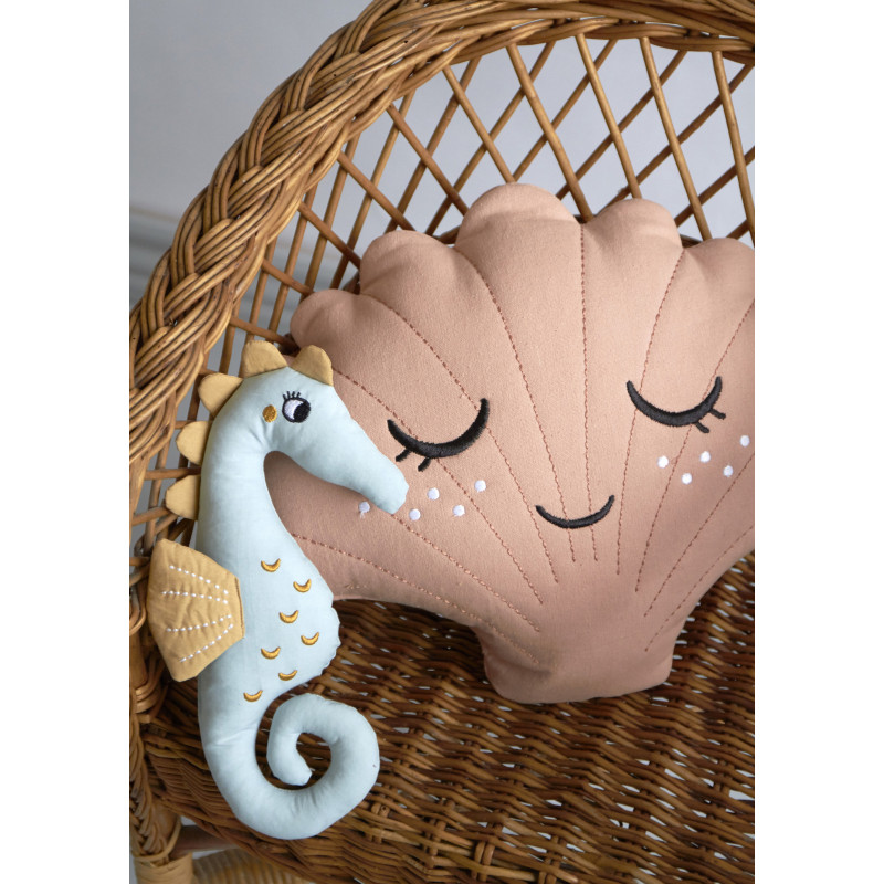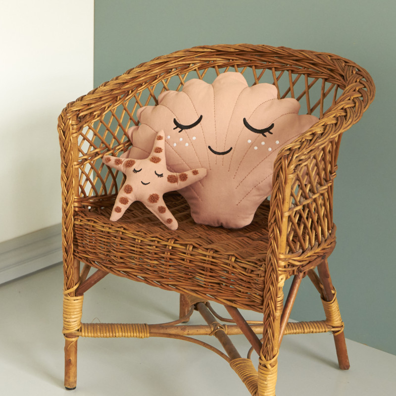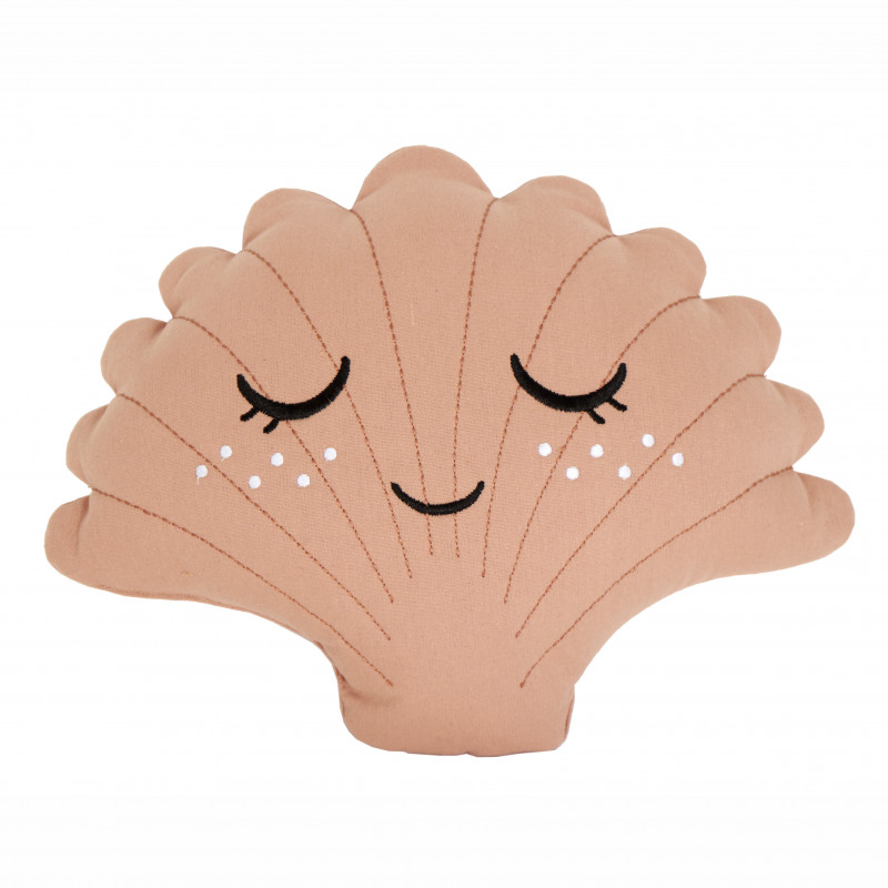 En snygg ekologisk kudde i form av en gammelrosa snäcka med broderad design med blundande ögon. Designen ger en lite lugnande effekt och du kan drömma dig bort till vackra stränder. En snygg detalj för soffan eller sängen. Oeko-Tex certifierad och tillverkad av ekologisk bomull och polyesterfyllning. Tvättas vid behov i 30°C skontvätt och häng-/plantorkas. Storlek: ca 32 x 40 x 10 cm.