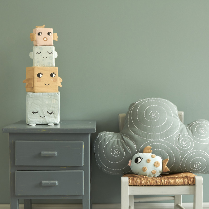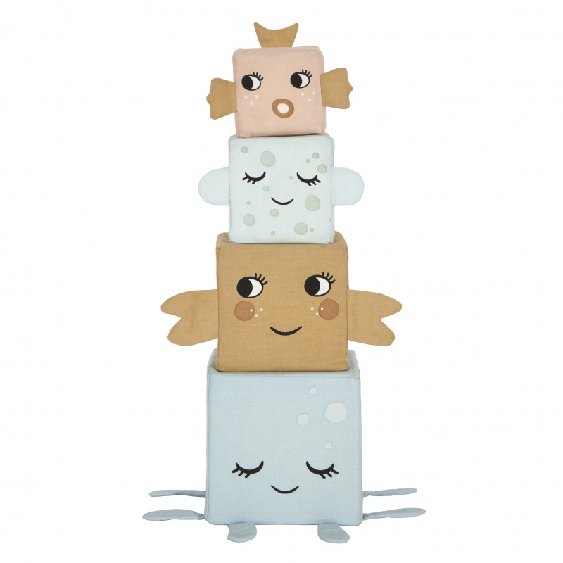 Snygga och roliga stapelblock i tyg från Roommate med 4 olika djur som kan hittas i vatten. Blocken är mjuka nog att tryckas ihop om du råkar trampa på dem eller babyn råkar ramla över dem, men fasta nog att staplas utan problem. Tillverkade i 100% ekologisk bomull med tryckt och fastsydd design, över polyuretan block. Testade för skadliga ämnen.